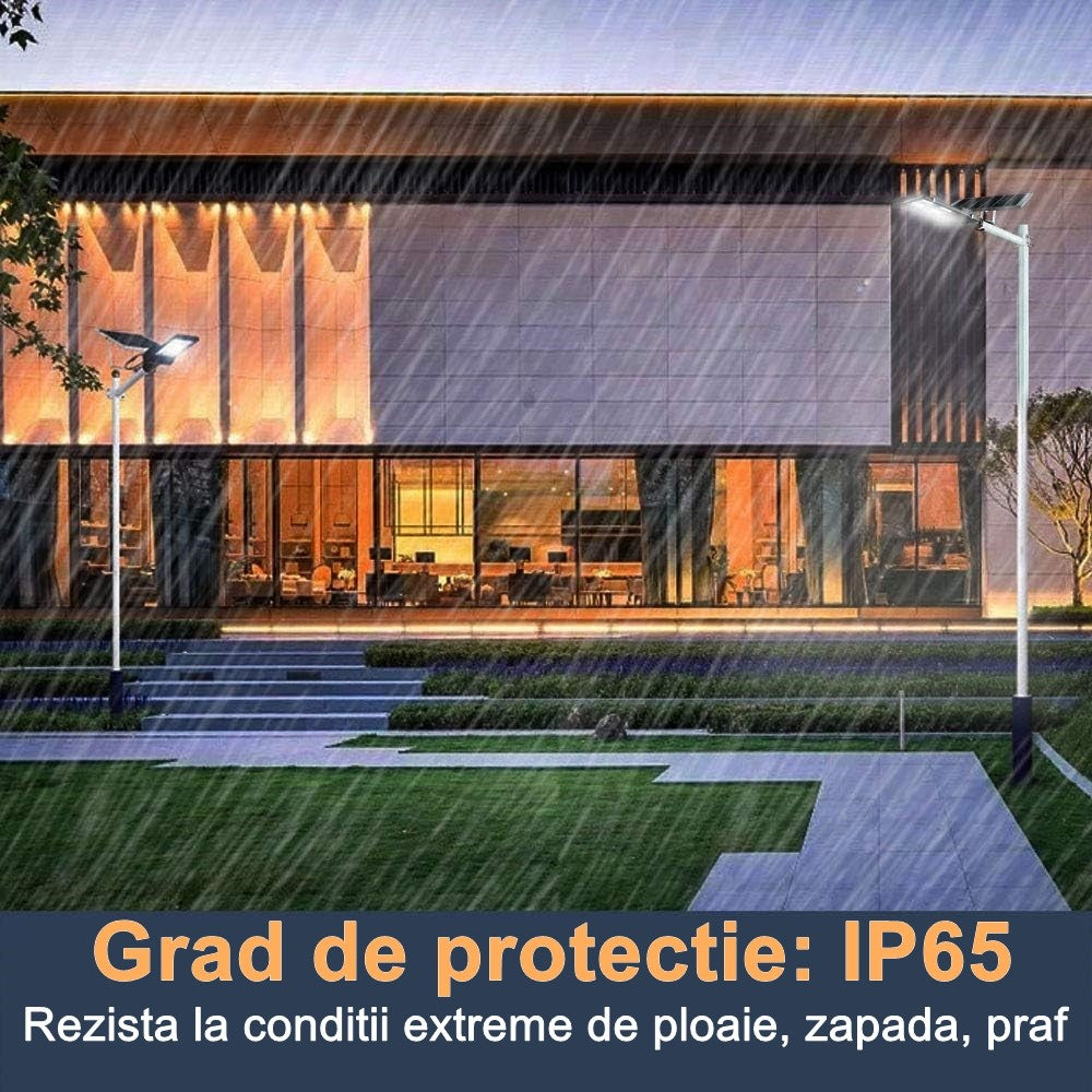 Rezistenta la apa si montare usoara: Datorita clasificarii IP65, lampa solara Practicpentrucasa este rezistenta la apa, putand fi utilizata in conditii atmosferice variate. Montarea se realizeaza prin fixare, ceea ce faciliteaza instalarea in diverse locatii fara a necesita conexiuni complicate la reteaua electrica.