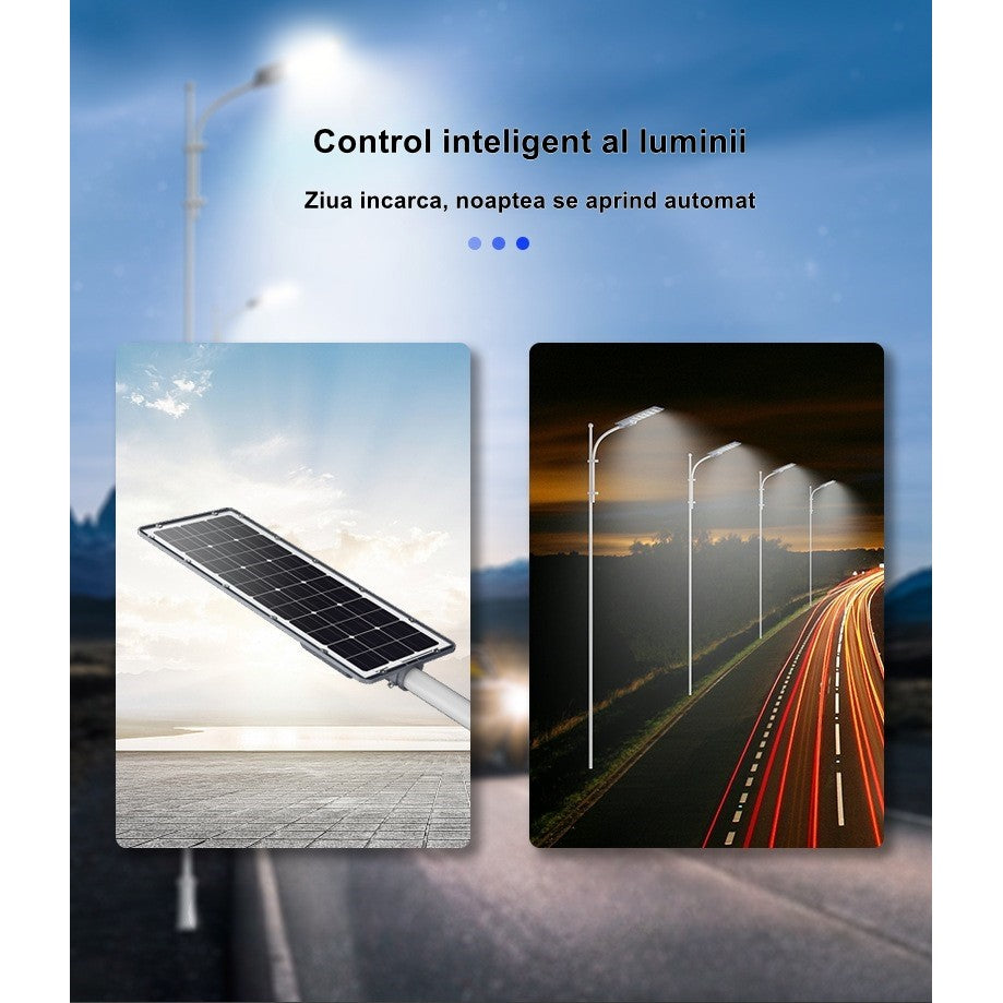 Eficienta energetica: Lampa solara stradala utilizeaza energia solara pentru a se alimenta. Este echipata cu o baterie de litiu care se incarca pe timpul zilei prin intermediul panourilor solare integrate. Aceasta asigura o utilizare eficienta a energiei si elimina nevoia de alimentare electrica suplimentara, contribuind la economisirea de energie si la reducerea costurilor.